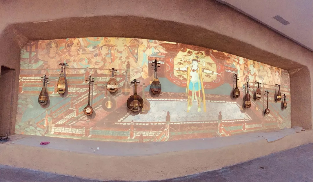 踏進(jìn)“敦煌樂舞”按照敦煌壁畫原景高度還原的影像投射墻步入眼簾,敦煌特色民族樂器被錯(cuò)落有致地安排在了墻面兩邊,飛天神女做反彈琵琶的身形,其神態(tài)雍容、身姿綽約地穿梭與樂器中,兩者虛實(shí)相合、相互映襯。