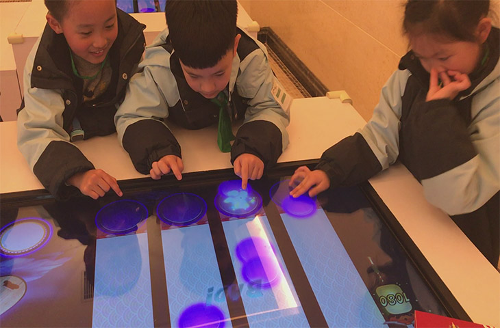 桌面互動投影是比較常見的一種互動投影形式,主要由投影機將制作好的立體三維影像畫面投射在指定的桌面上,人們可通過手指、手掌、手臂來觸摸調控投影畫面進行互動交流,給人們一種新奇的互動體驗形式。